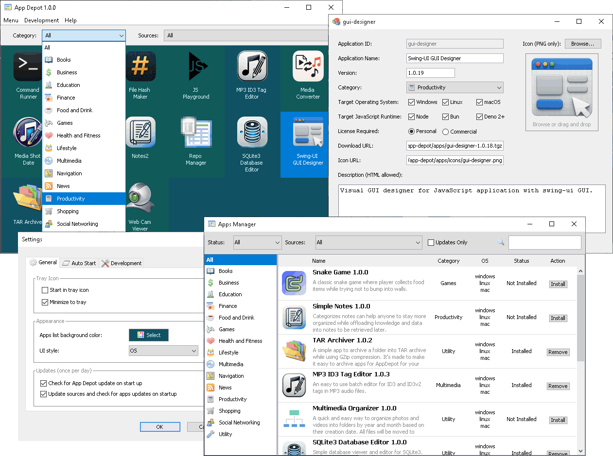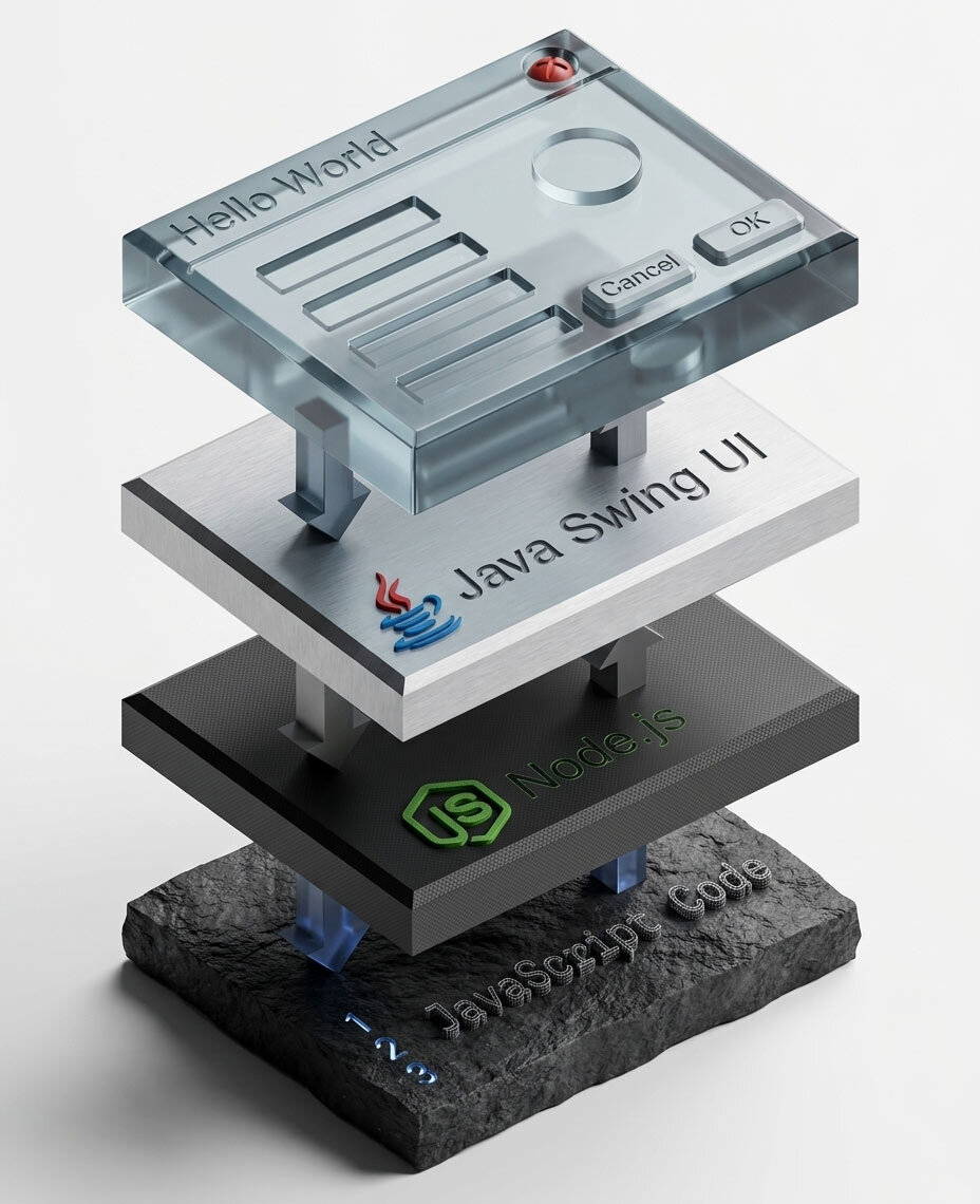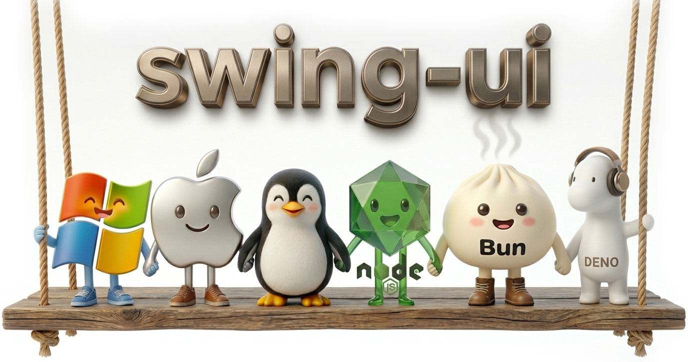 swing-ui is an awesome graphical user interface module for Node.js that works on Windows, Linux and Mac. All you need is Node.js, Bun or Deno 2 and Java 11+ (JRE or JDK) on your system to be able to create beautiful interactive window forms, buttons, text editor, lists, tables, progress bars, split panels, menu, submenu, context menu, tray icon, toolbar, file chooser, color picker, dialog windows, check box, radio box, sliders and much more.